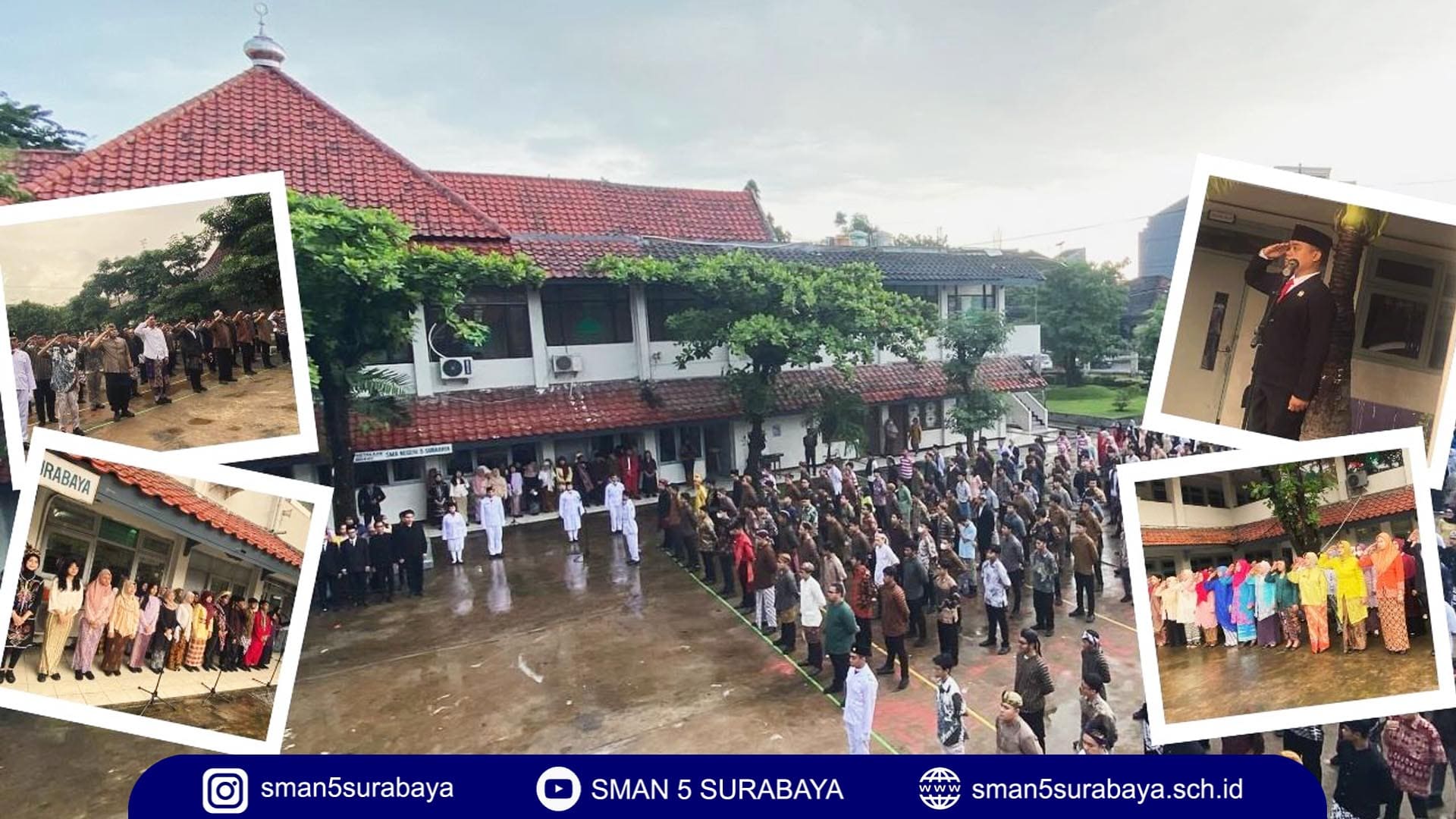 Hari ini Jumat, 2 Mei 2025, SMA Negeri 5 Surabaya memperingati Hari Pendidikan Nasional sebagai bentuk penghormatan kepada Ki Hajar Dewantara, pelopor pendidikan di Indonesia. Meskipun sebelumnya sempat diguyur hujan pelaksanaan upacara tetap dilaksanakan sehingga waktu pelaksanaannya agak mundur. Peringatan Hardiknas kali ini siswa-siswi tidak menggunakan seragam sekolah tetapi memakai baju adat nasional sedangkan guru-gurunya menggunakan kebaya nasional (Ibu-Ibu) dan Bapak-Bapak memakai jas formal. Tema Hardiknas tahun ini adalah “Bergerak Bersama, Lanjutkan Merdeka Belajar”.
