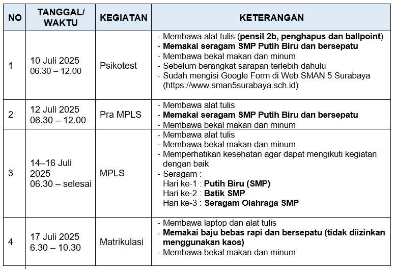 selamat kepada seluruh calon peserta didik baru yang telah diterima di SMAN 5 Surabaya. Seluruh calon murid baru yang diterima di SMA Negeri 5 Surabaya wajib melakukan daftar ulang dengan syarat :